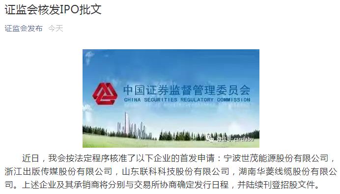 【证监会核发4家公司IPO批文】近日,证监会按法定程序核准了以下企业的首发申请:宁波世茂能源股份有限公司,浙江出版传媒股份有限公司,山东联科科技股份有限公司,湖