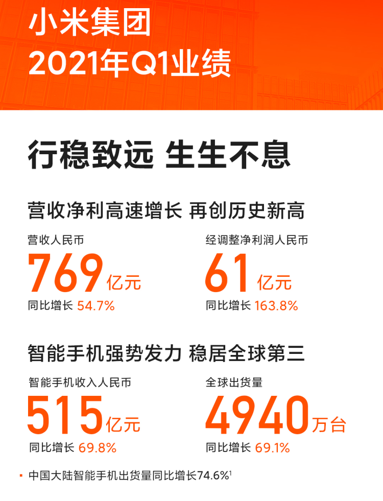 2021年5月26日,小米集团公布2021年第一季度业绩。总营收达人民币769亿元,同比增长54 7%;经调整净利润人民币61亿元,同比增长163 8%。研发投