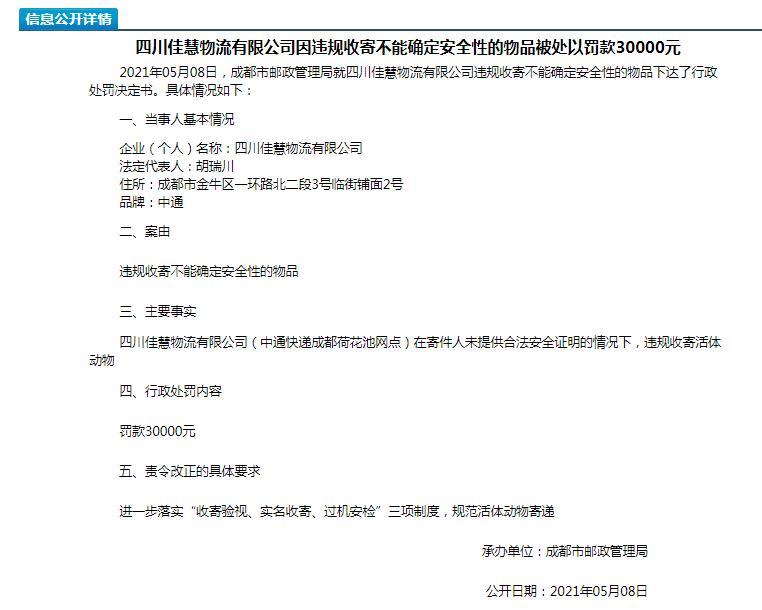 据成都市邮政管理局网站8日消息,宠物盲盒涉事两企业遭行政处罚。 此前据新华社报道,志愿者在四川成都一快递点拦截了160多个宠物盲