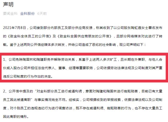 对此,金科股份当天发布声明称,“公司免除陶国林和陶建职务并解除劳动关系,系基于上述两人多次旷工,且长期在外兼职、与他人合伙或入股办公司并担任法定代表人、董事、经理等重要职务,公司依据劳动法律法规及公司制度对其严重违反公司制度的行为作出的决定。”