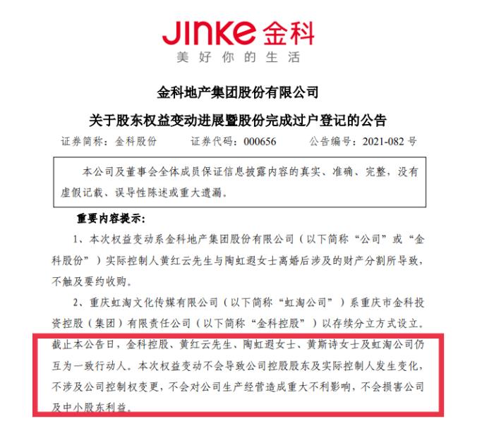 2021年6月28日,金科股份在公告黄红云与陶虹遐完成离婚股权分配的过户登记时,也强调了双方签署了《一致行动协议》,表示双方依然是一致行动人。同时,若陶虹遐持有的股份需转让,须优先转让给黄红云。