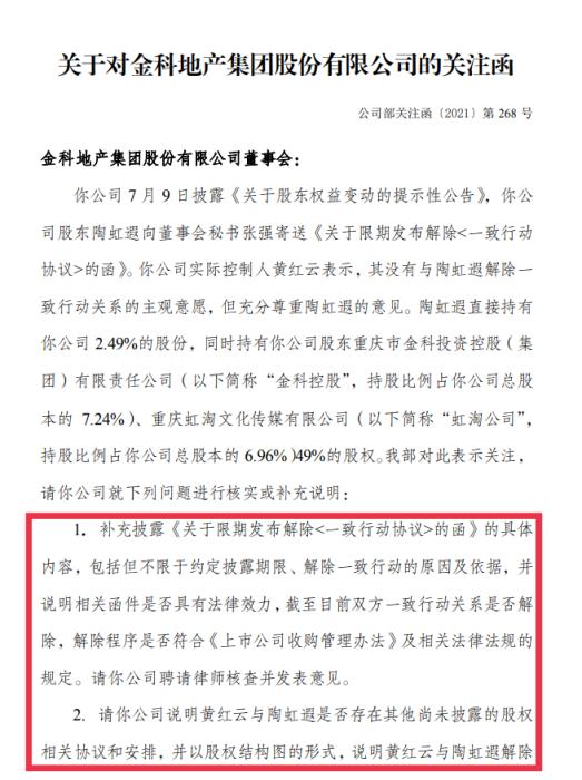 面对金科股份出现的事项,深交所7月13日向金科股份下发关注函,要求金科股份补充披露《关于限期发布解除<一致行动协议>的函》的具体内容,说明黄红云与陶虹遐是否存在其他尚未披露的股权相关协议和安排。