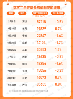 《报告》显示,8月全国65个主要城市二手房平均挂牌价格为17020元/,环比下降0.03%,65个城市中有27个城市二手房挂牌价格环比上涨。北京、深圳、上海二手房平均挂牌价格仍在5万元/以上水平。值得注意的是,在实施二手房参考价格制度的10个城市中,调控效果明显,6个城市的挂牌价格逐月下降,成都、绍兴、宁波分别下降1.7%、1.6%、1.4%,Xi安下降0.8%,深圳紧随其后,下降0.5%。