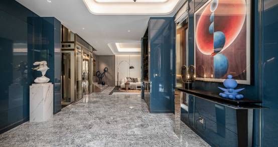 在新庭院的样板间里,“克莱因蓝”和“莫奈灰”的灵感来源于设计师TESS,使得玄关和客厅的美学别具一格。作为进入空间的第一印象,这种不引人注目、温暖舒适的新色彩,始终传达着主人从容、优雅、时尚的前卫艺术品味。再通过象征奢华的金色饰条进行点缀镶嵌,低调中蕴含奢华质感;同时还有不同的深浅和深浅,营造出丰富的感官体验和审美趣味。