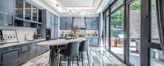 以茂源京西玺的厨房空间为例,整个地板被蓝灰色和深灰色的灵动双空间所体现,并与高档的灰色大理石地板相呼应,形成立体的视觉平衡,将整个厨房中的色彩完美融合成独特的空间感。特别值得一提的是,蓝色用于独立的中西厨房空间
