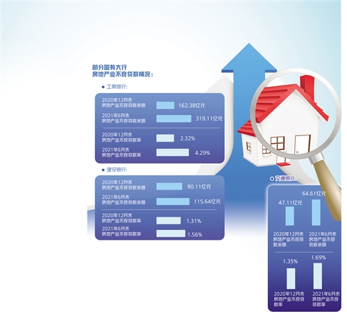 国有银行披露的数据显示,截至2021年6月末,工商银行、建设银行、交通银行房地产行业不良贷款余额分别为319.11亿元、115.64亿元、64.61亿元,较上年末分别增加156.73亿元、25.53亿元、17.50亿元。房地产行业不良贷款率分别为4.29%、1.56%和1.69%,较上年末分别上升1.97个百分点、0.25个百分点和0.34个百分点。
