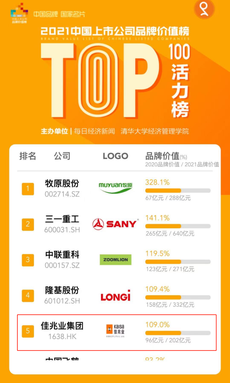 5月10日,正值第五个中国品牌日,在每日经济新闻联合清华大学经济管理学院举办的2021中国上市公司品牌价值榜发布会上,佳兆业集团凭借