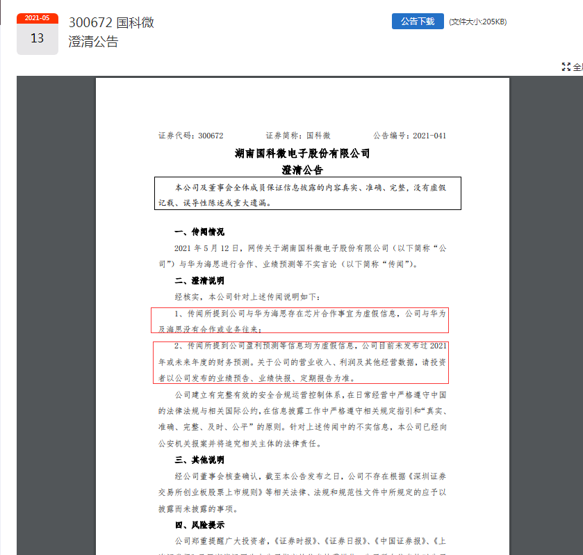 5月12日晚间,国科微发布澄清公告称,传闻所提到公司与华为海思存在芯片合作事宜为虚假信息,公司与华为及海思没有合作或业务往来。