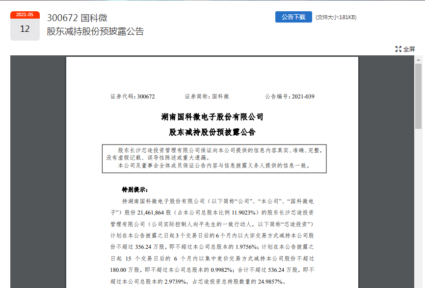 值得注意的是,5月11日晚间,国科微5月11日晚间公告,实际控制人的一致行动人芯图投资拟采用大宗交易和集中竞价方式合计减持不超过 536.24万股,不超过本公司总股本的2.9739%。