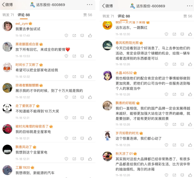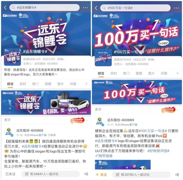 自11月4日远东股份发起“百万大奖”投票征集活动以来,迅速引爆社交平台,成功“出圈”,微博话题#远东锦鲤令#冲上微博热搜榜并持续霸屏,阅读量已经超过了6800万,3.9万人次参与讨论,其中不乏粉丝近千万的微博大V、行业达人。