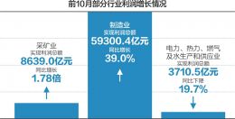此外,采矿业和原材料制造业的利润增长明显加快。10月份,在生产资料价格高企的带动下,采矿业和原材料制造业利润分别同比增长2.81倍和56.1%,均明显高于工业平均水平,增速分别较上月提高51.7和18.4个百分点。