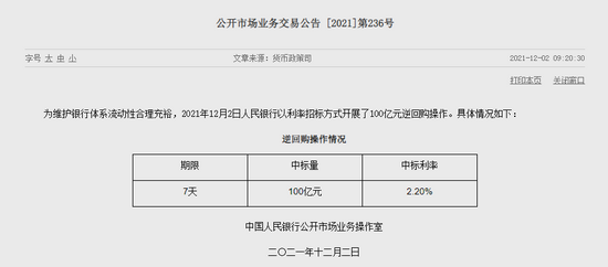 今天央行推出100亿元逆回购操作,因为今天1000亿元逆回购到期,当天实现净回笼900亿元。