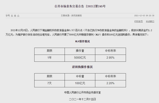 2021年12月15日,中国人民银行下调金融机构存款准备金率0.5个百分点(已执行5%存款准备金率的金融机构除外),释放长期资金约1.2万亿元。为保持银行体系流动性合理充裕,人民银行开展了5000亿元中期贷款便利(MLF)操作和100亿元逆回购操作。