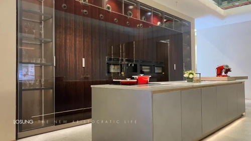 在厨房空间设计中,品牌运用艺术“简”创意手段,经过精心思考,进行创造性的组合。智能中岛、豪车内饰元素、金属、弧形等等在此空间一一构列出来,加上新一代灯光智能照明灯具系统,增加整体空间温暖效果,空间调性。