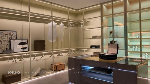 在蓝谷新贵生活设计中,大家可以看到很多不同的设计创意:金属圆与几何形完美融合对撞,艺术涂料与金属不锈钢的对比,九宫格的列阵和当下艺术潮玩的罗列等等。品牌很好地融合了如今80后,90后的喜好,从他们的消费趋势出发,在设计上精益求精。