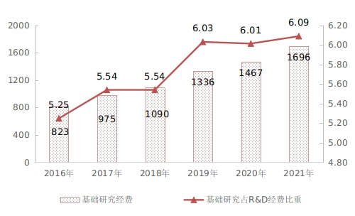 图22016-2021年全国基础研究经费及占RD经费比重情况