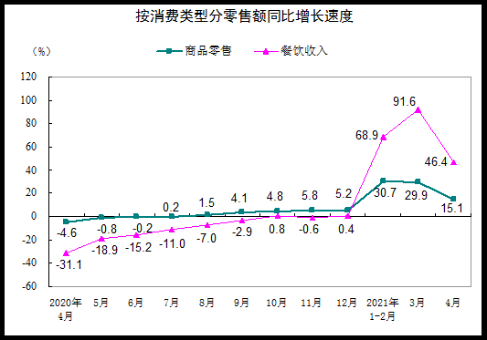 按消费类型分,4月份,商品零售29776亿元,同比增长15.1%,两年平均增长4.8%;餐饮收入3377亿元,增长46.4%,两年平均增长0.4%。1—4月份,商品零售124401亿元,同比增长26.4%,两年平均增长4.8%;餐饮收入13973亿元,增长67.7%,两年平均下降0.7%。
