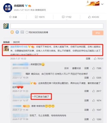 之后,“行业之幸”被广泛应用,考生常将“行业之幸”与“别给自己压力太大”句式进行搭配,显得朗朗上口,更具杀伤力。2020年下旬,“行业之幸”句式在微博评论区热评中更加频繁出现,甚至有人挖出了马峰“别给自己压力太大”句式的原视频,弹幕除了刷屏“别骂了别骂了”“名场面”之外,甚至还能看到“神清气爽”“每日一遍,血压无限!”这类求虐行为的出现。