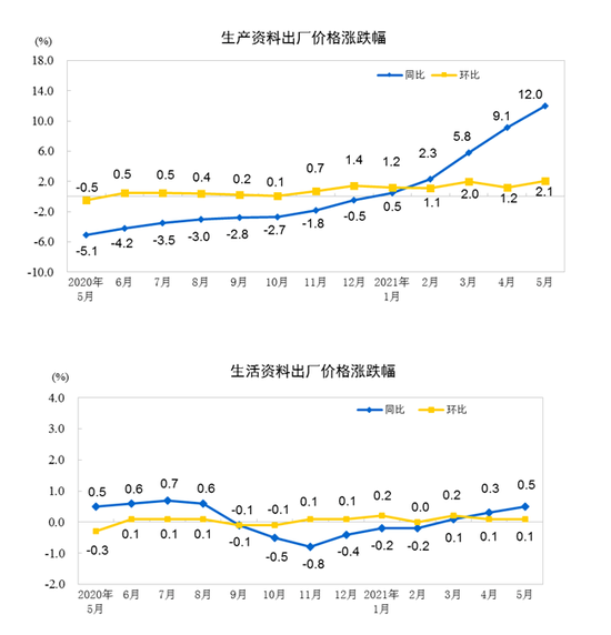 2021年5月份,全国工业生产者出厂价格同比上涨9.0%,环比上涨1.6%;工业生产者购进价格同比上涨12.5%,环比上涨1.9%。1—5月平均,工业生产者出厂价格比去年同期上涨4.4%,工业生产者购进价格上涨5.9%。