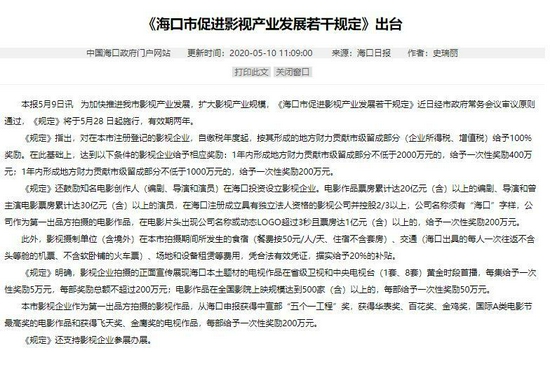 2020年5月,海口出台的《海口市促进影视产业发展若干规定》指出,对在本市注册登记的影视企业,自缴税年度起,按其形成的地方财力贡献市级留成部分(企业所得税、增值税)给予100%奖励;随后6月,财政部、税务总局发布关于海南自由贸易港的企业所得税、个人所得税优惠政策,明确鼓励类产业企业减按15%的税率征收企业所得税。