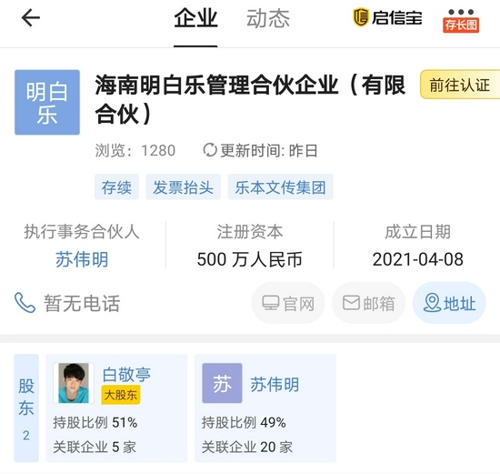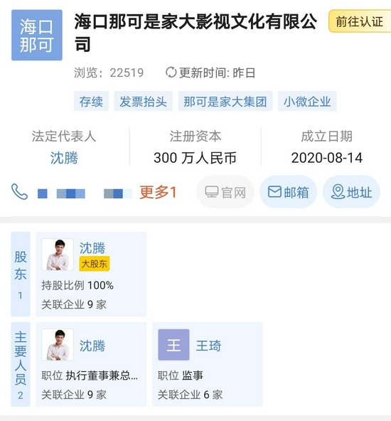 每经记者查询发现,2020年5月徐峥在海南成立了海南省洋洋得意文化传播有限公司,注册资本为100万元,徐峥和妻子陶虹各持股50%;到了8月,沈腾也成立了海口那可是家大影视文化有限公司,注册资本300万元,沈腾100%持股;2021年4月,白敬亭成立了海南明白乐管理合伙企业(有限合伙),白敬亭持股51%,为第一大股东。