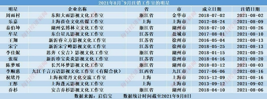 今年8月至9月,乔杉、班比等共13位明星取消工作室,主要集中在浙江、上海、江苏等地。