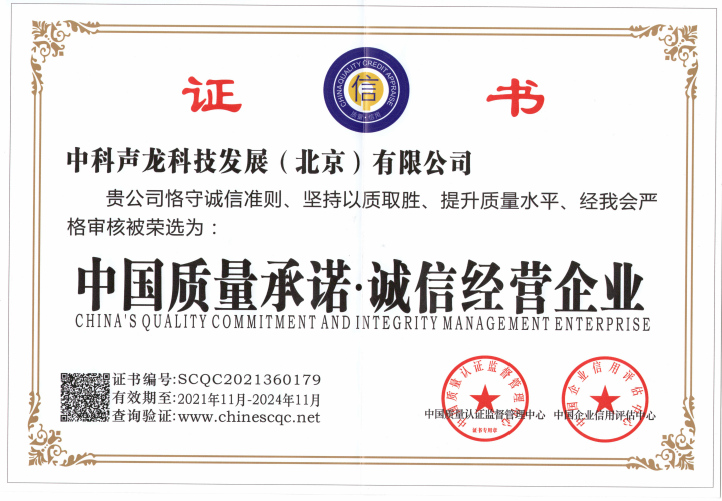 2021年11月,中科声龙荣获《中国质量认证监督管理中心》颁发的中国质量承诺·诚信经营企业认证,