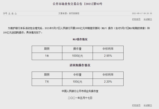 央行开展1000亿元1年期MLF操作 操作利率为2.95%