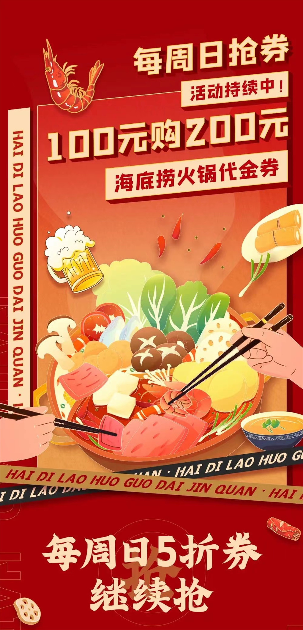 2021年11月21日-2021年12月31日的每周日,全民生活APP惠买单频道100元买海底捞200元代金券,购券后30日可用。数量有限,先到先得。