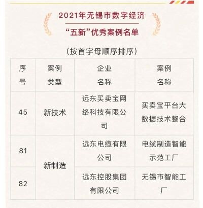 近日,无锡市信息化协会公示了2021年无锡市数字经济“五新”优秀案例名单,远东控股集团有限公司“无锡市智能工厂”、远东电缆有限公司“电缆制造智能示范工厂”、远东买卖宝网络科技有限公司“买卖宝平台大数据技术整合”三项案例入选。