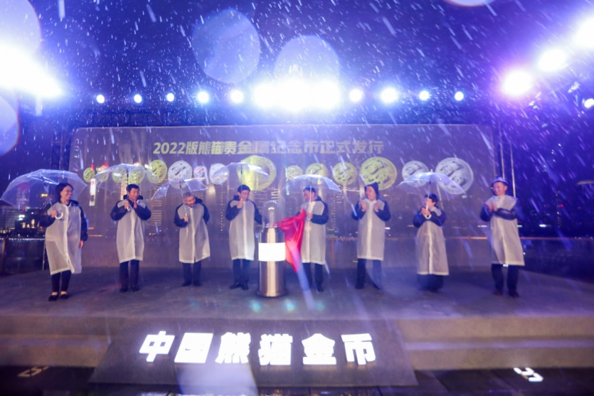 领导、嘉宾上台为2022版熊猫贵金属纪念币揭幕