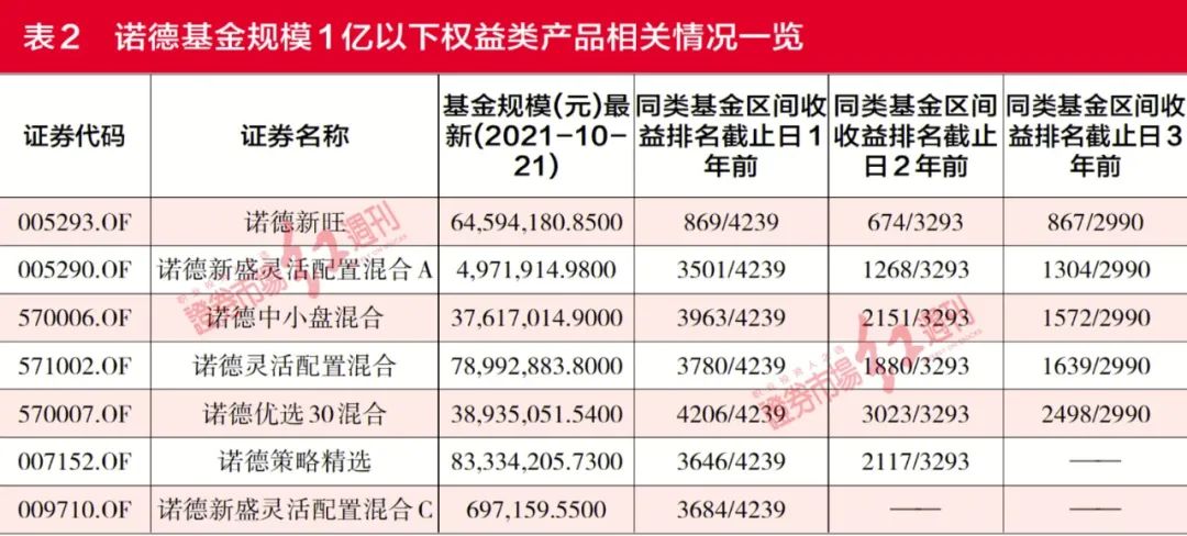 从规模榜单垫底的产品来看,记者注意到诺德新盛、诺德优选30、诺德中小盘成为规模榜最后三位的主动权益产品。记者查阅上述基金的二季报,发现三只基金无一例外地在文字表述中提示了清盘风险,只不过相比其他两只连续60个交易日基金资产净值低于5000万元,诺德中小盘是连续20个交易日程度稍轻。其中新盛和中小盘的现任基金经理都是顾钰,而优选30的基金经理则是杨霞辉。