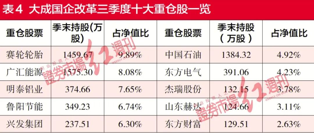 从三季报来看,韩创管理的三只基金是十大重仓股完全一致,只是重仓的先后次序不同。仍以明显风格漂移的大成国企改革为例,三季度调仓力度很大,仅保留了上一季重仓过的鲁阳节能、兴发集团、明泰铝业三只重仓股,且对于看好标的股高比例配置,比如9月30日时的头两号重仓赛轮轮胎和广汇能源,两者分别被配比约9.89%和8.08%。从二级市场来看,两只股票开年迄今的涨幅均翻番。