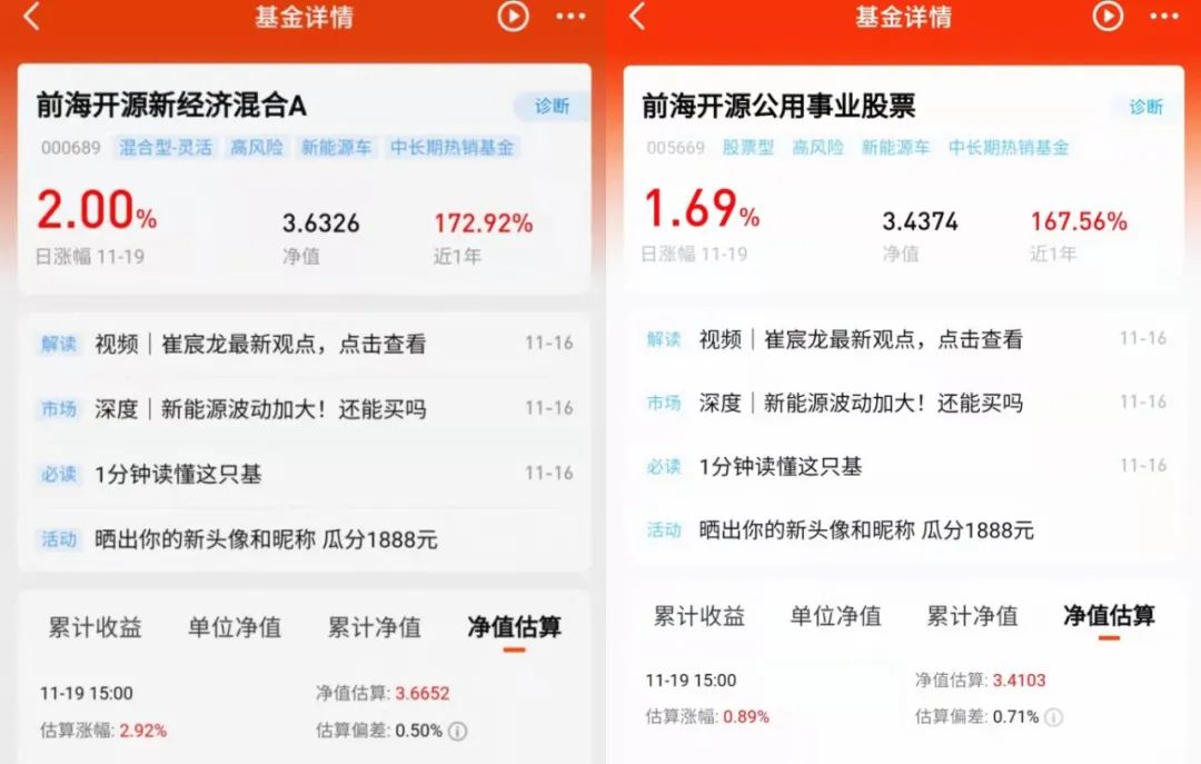 比如11月19日,崔管理的前海开源公用事业预计净值上涨0.89%,实际净值上涨1.69%。另一只由崔管理的基金,前海开源新经济A,基金实际净值与预计净值相差超过0.9个百分点。