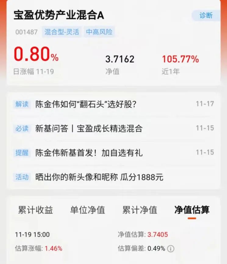 无独有偶,陈金伟管理的宝盈优势产业混合A基金实际净值也与预计净值存在偏差。11月19日,宝应优势产业A预计净值上涨1.46%,基金净值实际上涨0.8%。