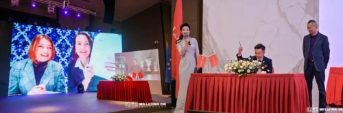 ▲Marcel Wanders 工作室签约代表 Verdiana、Loredana X 唯美L&D品牌事业部总经理吴阳先生 现场连线签约