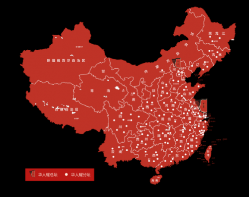 截止至2021年12月,华人耀已在全国,上海、北京、广州、深圳、北京、温州、长沙、泉州、沈阳、杭州、南昌、南京、郑州、厦门、合肥、西安、重庆、贵阳、苏州、德兴、昆明、青岛、连云港、池州等城市,开设超100家以上线下分坛品鉴会所。