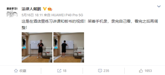 早在戴鹏刚出道做司考讲师的时候,就拿着自己编写的讲义,带着矿泉水,挤着公交车,到各个机构去投稿面试。自此之后,戴鹏就不断地提升自己的授课水平和能力,直到今天,讲了成百上千堂课之后,他依旧在坚持着,不断提升自己的授课能力。