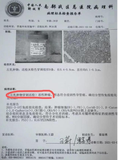 另一位庄女士反映,今年3月份她被确诊罹患左乳腺癌,4月份申请大病互助,同样收到了相互宝的拒赔通知,理由是因为庄女士曾被诊断右乳肿物,就诊病例上有“积乳?”两字,不符合健康条约。