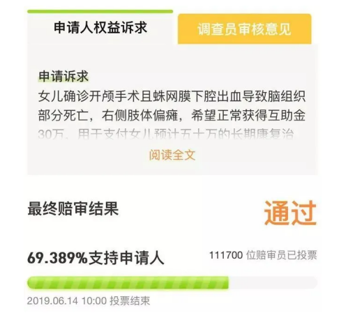 此次拒赔风波引起了社会的广泛关注,相互宝决定通过赔审团投票决定“赔”还是“不赔”,最终这位父亲以69.389%的支持率拿到了互助金。