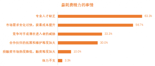 调研数据显示,今年30位上榜创业新贵创业过程中遇到的最大的障碍还是领导经验不足、资金不足、缺乏社会关系,2021年最让上榜创业新贵耗费精力的事情变成了“专业人才缺乏”。市场环境竞争的激烈,未来不仅仅是资金和商品的战争,更是人才的战争。