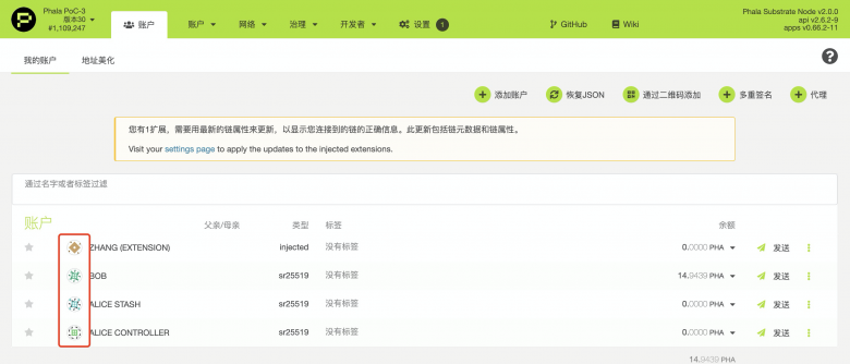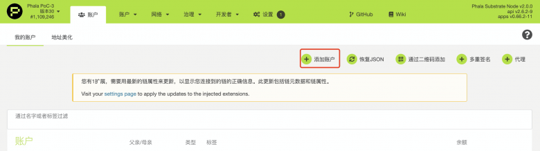 1. 进入 Phala 测试网账号管理页面 https://poc4a.phala.network/polkadotjs/#/accounts 或https://poc4.phala.network/polkadotjs/#/accounts 或备用链接https://poc4a-2.phala.network/polkadotjs/#/accounts
