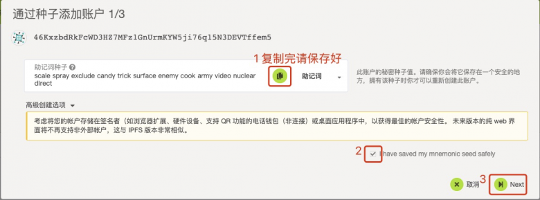3. 复制并记下助记词种子,在弹窗中勾选“I have saved my mnemonic seed safely”,再点击 Next。注意:这里的助记词种子请务必记录保存好!