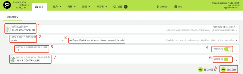 第二排选择 phala 模块,再选择 setPayoutPrefs(payout_comission, payout_target)