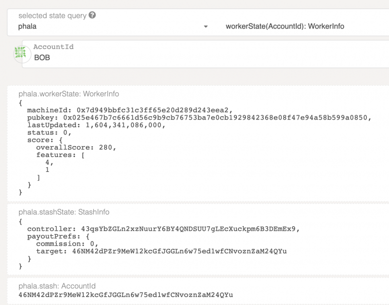 点击 phala 模块,旁边选择 workerState ,底下选择你的 stash 账号,点旁边的加号,底下会出现一些信息。