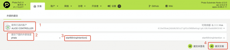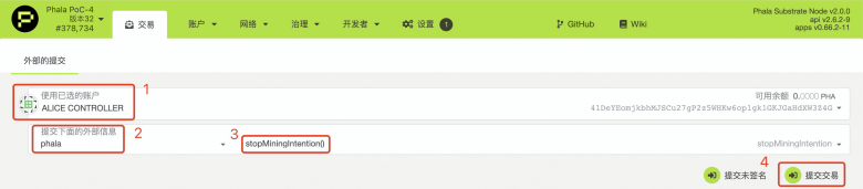选择 controller 账号,选择 phala → stopMiningIntention() → Submit Transaction 。签名等待广播。