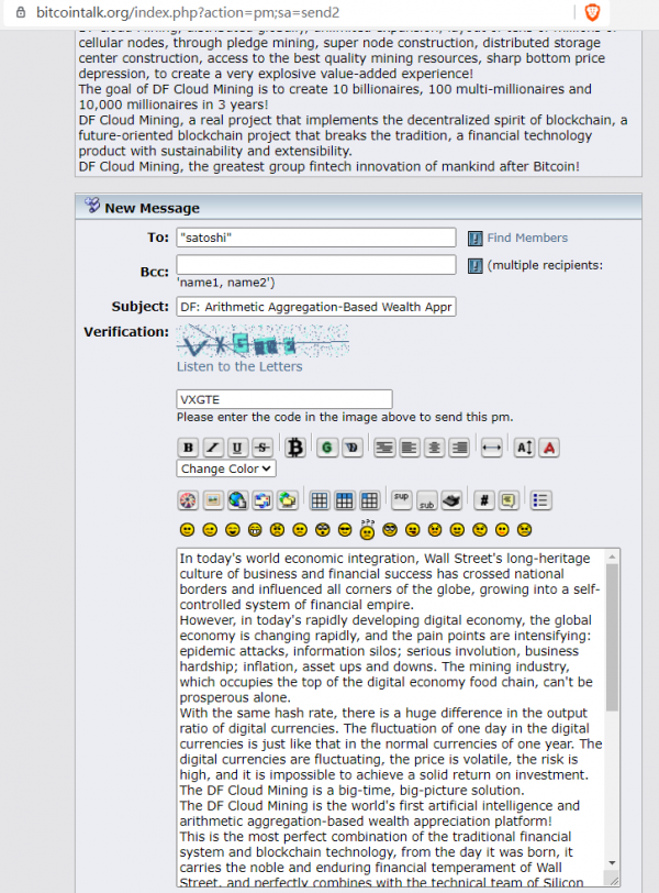 近日,在当年中本聪曾经活跃的bitcointalk上,DF智能云矿高调发布了项目启动宣言,并把DF智能云矿的项目介绍以信息留言的方式发给了中本聪的账户,以这种方式向这位伟大的探索者致敬!