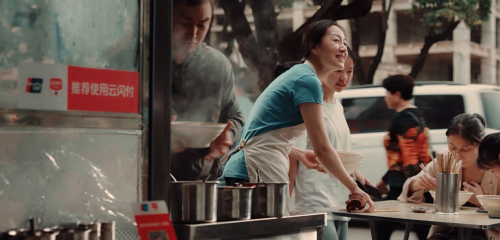 * 老板娘告诉客人扫桌上的码付钱
