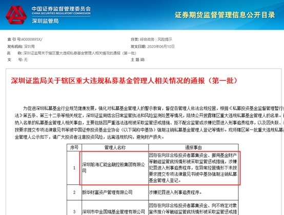 去年6月,深圳证监局对辖区重大违规私募基金管理人相关情况进行通报,第一批名单中的第一家公司就是深圳前海汇能金融控股集团有限公司。