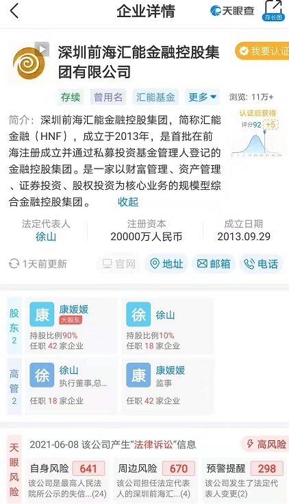 天眼查资料显示,深圳前海汇能金融控股集团有限公司成立于2013年,公司简介显示,该公司是一家财富管理、资产管理、证券投资、股权投资为核心业务的规模型综合金融控股集团,公司注册资本2亿元人民币,法定代表人为徐山。公司有两位股东,其中康媛媛持股比例90%,徐山持股比例10%。不过,天眼查显示,该公司存在众多风险记录,甚至已成为最高人民法院所公示的失信公司。